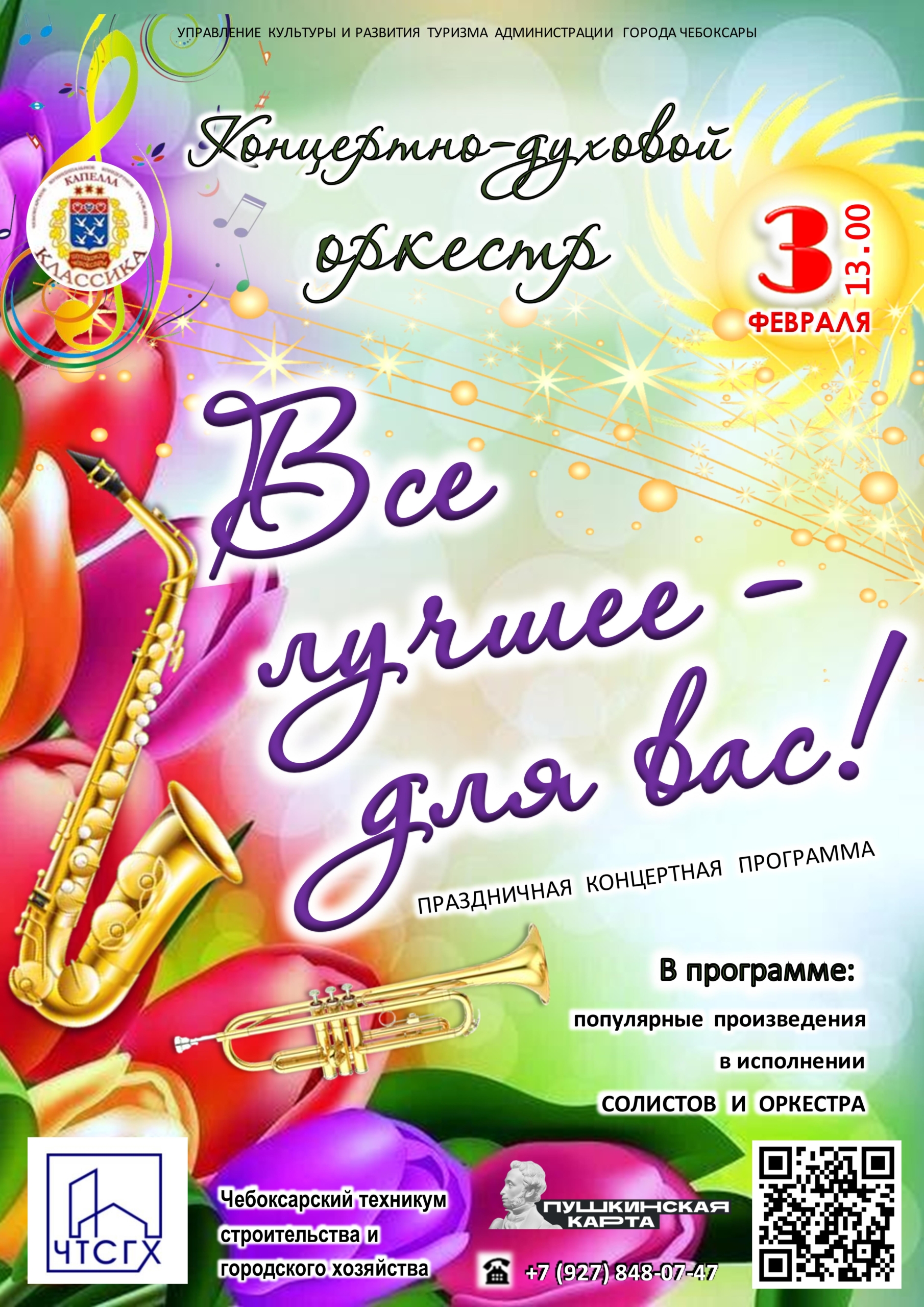 В честь знаменательного события — столетия «Чебоксарского техникума строительства и городского хозяйства» Министерства образования Чувашской Республики — приглашаем студентов техникума на грандиозный концерт Концертно-духового оркестра Капеллы “Классика”!