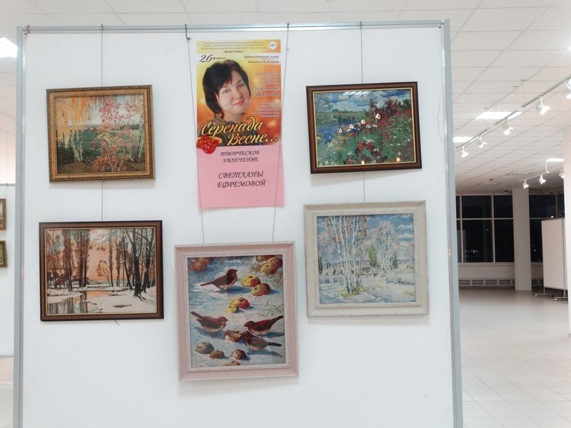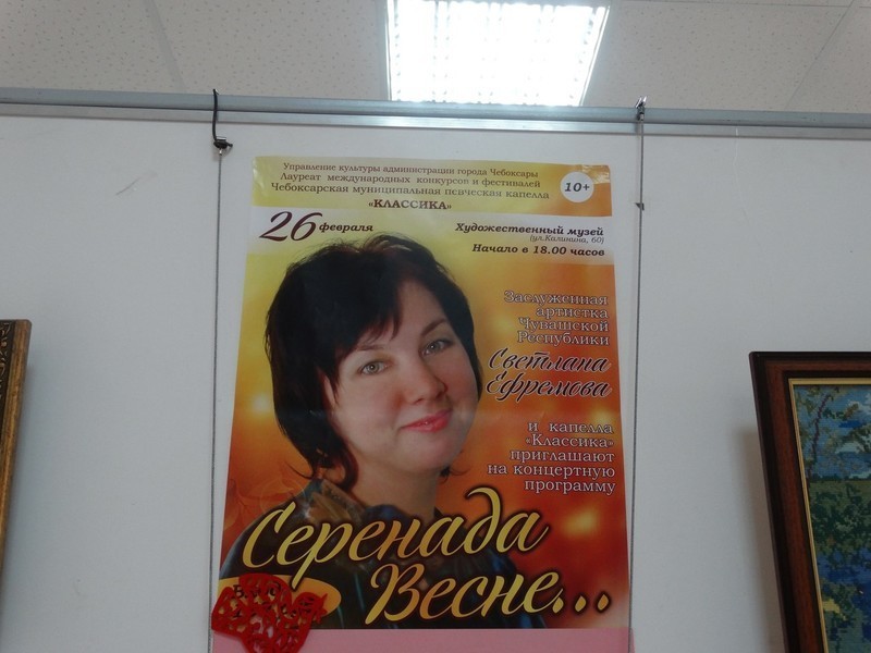 26 февраля в уютных стенах Чувашского Государственного Художественного музея состоялся замечательный концерт Заслуженной артистки Чувашии Светланы Ефремовой и капеллы “Классика”. В концерте приняли участие и юные артисты хора “Соловушки” музыкальной школы № 5 г. Чебоксары. Дирижер – Александра Васильева. На втором этаже Художественного музея организована выставка вышитых картин Светланы Ефремовой, которую сама артистка охарактеризовала: “Надо лишь начать что-то делать и тогда можно исполнить любое желание”.
