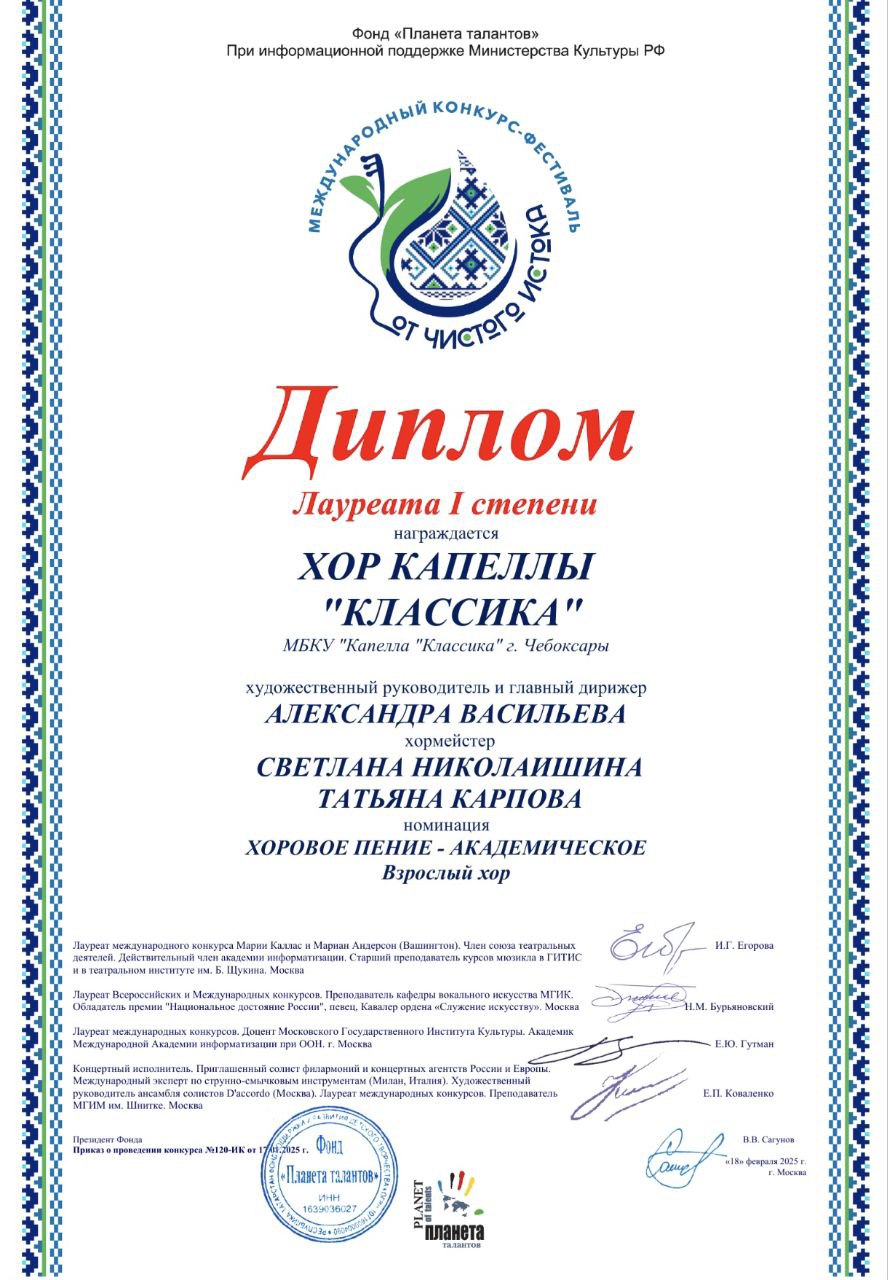 Хор – Лауреат 1 степени  международного конкурса “От чистого истока”