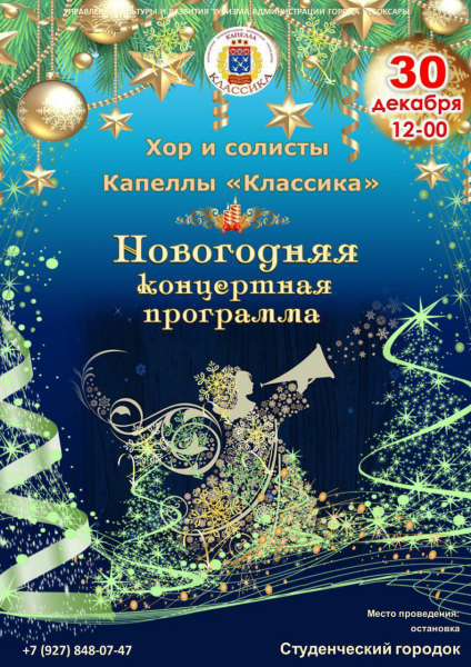 Перед жителями и гостями столицы Чувашии прямо на свежем воздухе выступят хор и солисты Капеллы “Классика”. Мероприятие организовано совместно с Общественным советом при УМВД России по г.Чебоксары в рамках акции “Полицейский Дед Мороз” Приглашаем чебоксарцев и гостей столицы Чувашии за новогодним настроением!